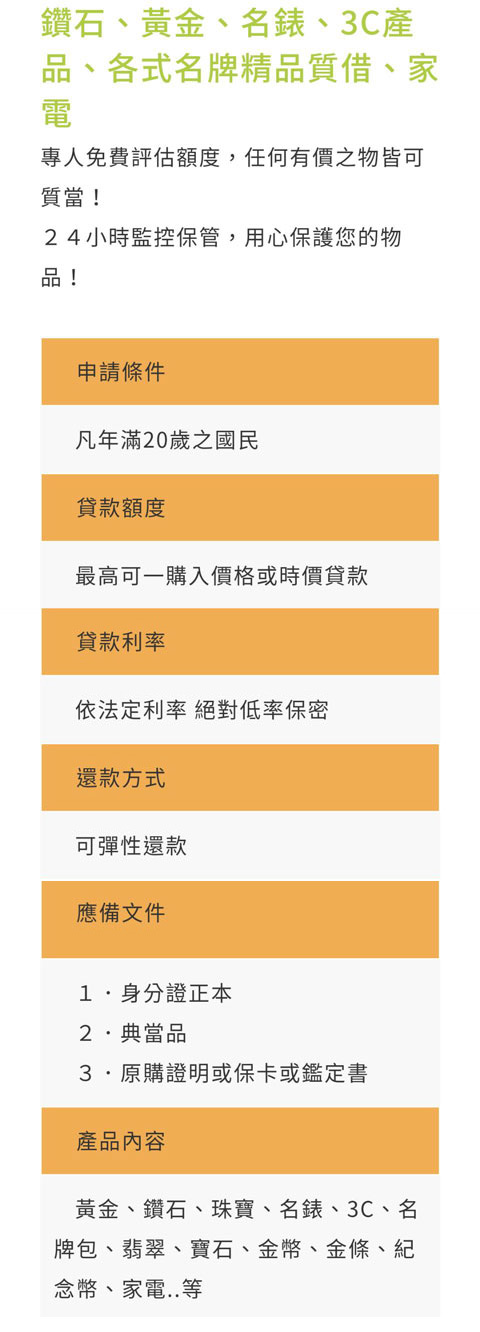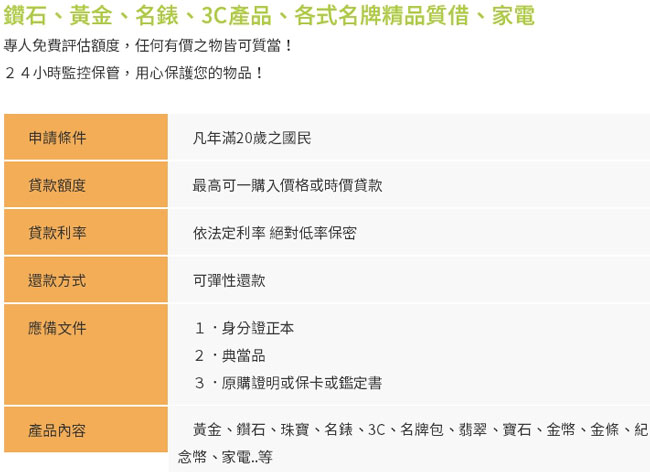 誠信的理念為經營原則,德泰樹林當舖以正派經營、專業、負責、積極的態度服務每一位客戶。借貸額度高、利率低,手續簡便,快速撥款,您周轉的......